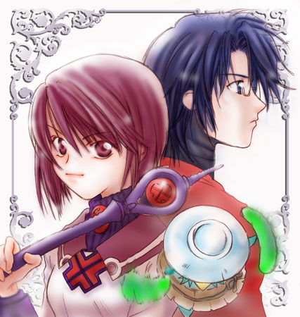 サモンナイト2の女主人公・トリスと兄弟子ネスティです。キュウリを振り回すカッパ付き♪
